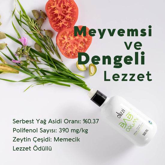 Olizzi Baby Organik, yüksek meyvemsilik, dengeli acılık ve yakıcılık seviyelerine sahip, zengin ve pürüzsüz tadı ile bebekler için zeytinyağı olarak iyi bir seçimdir.